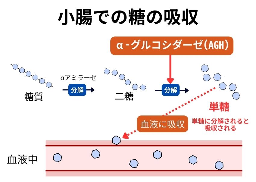 α-グルコシダーゼは、炭水化物を分解して単糖を作り出す酵素です。私たちが食べた炭水化物はα-グルコシダーゼによって単糖に分解されることで初めて血液中に吸収され、血糖値が上がります。